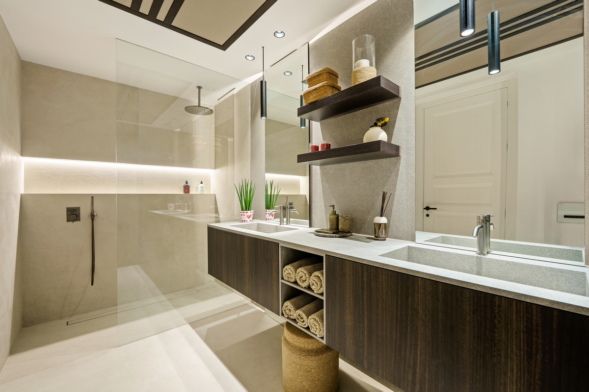 Spanning 605m² across three levels, the villa offers five bedrooms and four bathrooms, all crafted with the highest attention to detail. The main level features open-plan living and dining areas that flow seamlessly onto expansive terraces and a stunning 73 m² infinity pool, creating an effortless indoor–outdoor lifestyle ideal for entertaining or quiet relaxation.